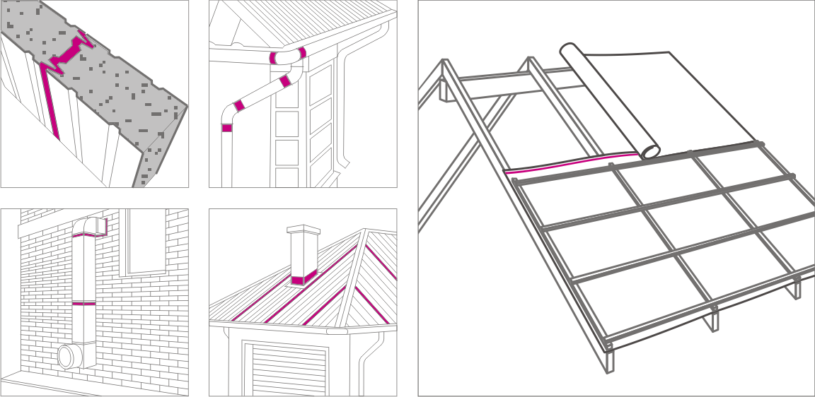 Обладает высокими эластичными и пластичными свойствами, обеспечивает воздухонепроницаемое и паронепроницаемое соединение пароизоляционных плёнок и мембран между собой. Возможно использование для изоляции мест повреждения пленок и мембран, для крепления самой паронепроницаемой плёнки к конструкциям и к другим материалам. Благодаря свойствам исходного материала – специального состава бутилкаучука – ленты обеспечивают долговечную паронепроницаемость стыка и образуют надежное соединение материалов в отличии от применения скотча.