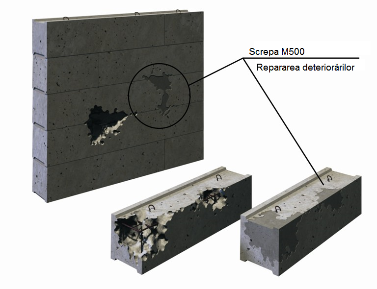 Suprafaţa din beton trebuie să fie structural dură şi curată. Curăţiţi suprafaţa de praf, murdărie, produse petroliere, depuneri de săruri, vopsea, şi alte substraturi care slăbesc adeziunea materialului Screpa M500 . În cazul dezgolirii armaturii în procesul de îndepărtare a betonului vechi, pregătiţi suprafaţa în conformitate cu următoarele recomandări: